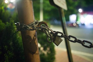 A close-up shot of a rusty chain tightly bound around a weathered pole, anchored by a sturdy padlock. The dim lighting creates an intimate, moody atmosphere, highlighting the textures of the rust and metal while softening the background into a blur of urban night life. The composition draws the eye towards the lock, evoking a sense of security and isolation amidst the softly illuminated surroundings.