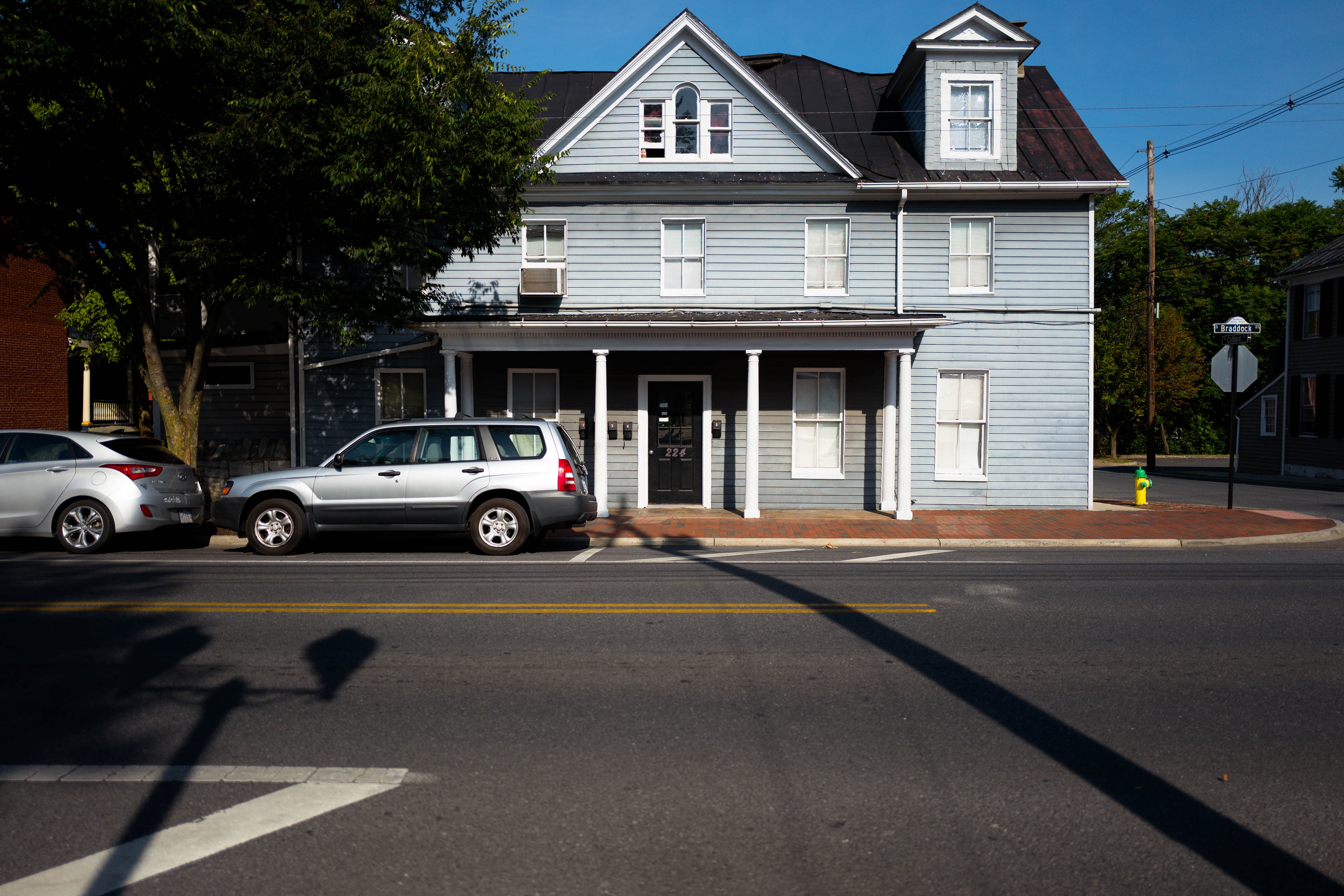 The photograph captures a serene street scene featuring a light blue two-story house, framed by parked cars and lush greenery. The composition emphasizes symmetry, with the house’s architecture standing proudly against a clear blue sky. Soft morning light bathes the scene, creating a calm and inviting atmosphere.