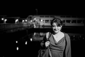 In this striking black-and-white photograph, a woman stands confidently illuminated by soft lights against a backdrop of a calm waterway. The mood is contemplative yet warm, with her gentle smile contrasting with the night’s stillness, while the ambient lights shimmer on the surface of the water, adding depth to the composition. Her elegant attire and poised stance suggest a moment of ease amidst the enigmatic night surroundings.
