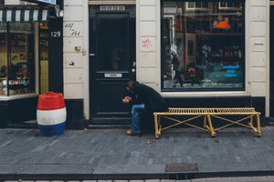 In this candid street scene, a figure sits alone on a yellow bench, absorbed in their phone, hinting at a moment of introspection. The muted colors and soft natural light create a somber yet reflective mood, contrasting with the vibrant storefronts behind them. The composition emphasizes the sense of isolation amidst the bustling urban environment, inviting viewers to ponder the story behind this solitary moment.
