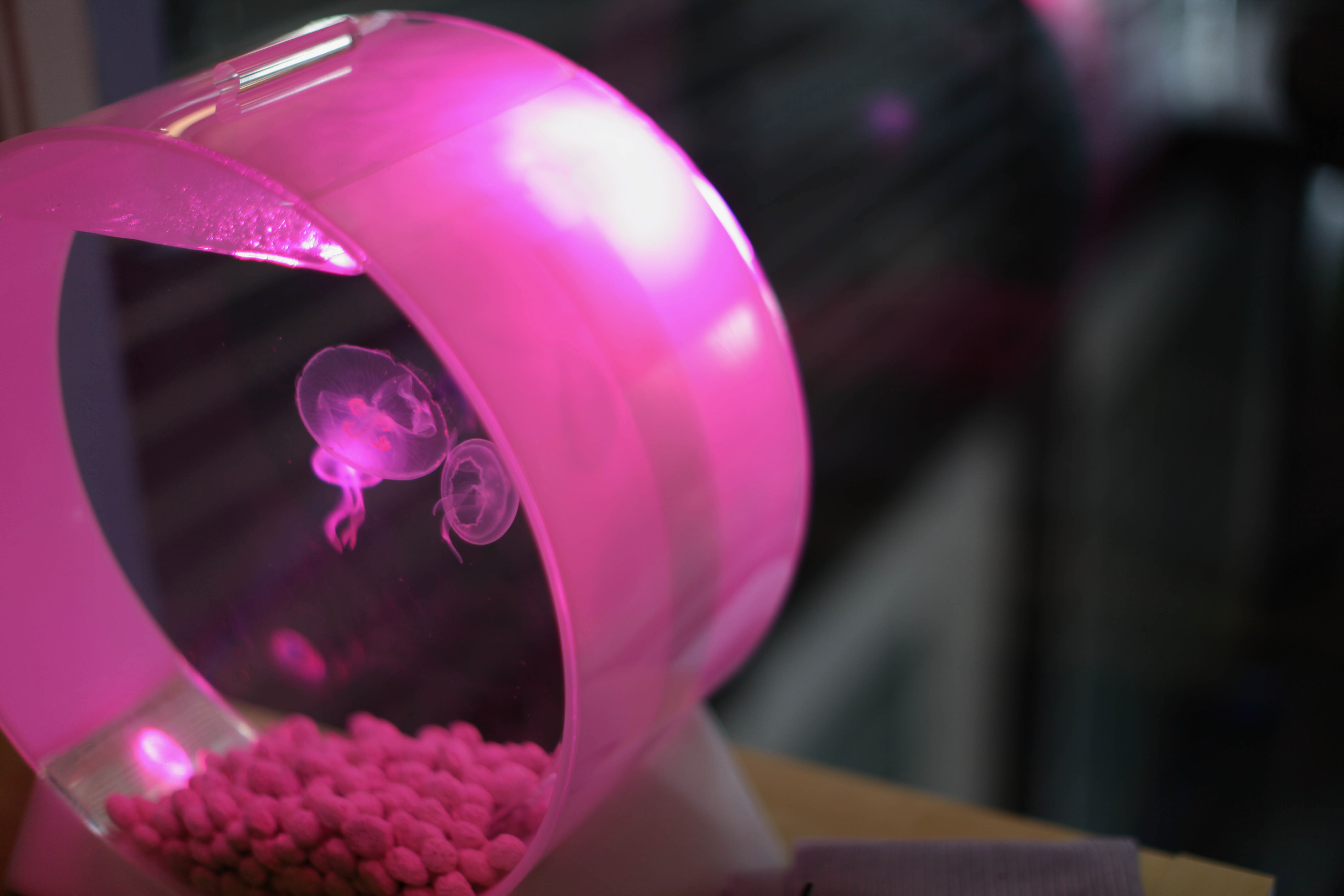 In a soft, surreal glow, a pair of jellyfish gracefully drift within a circular tank. The vibrant pink lighting casts an ethereal ambiance, contrasting with the smooth, transparent body of the jellyfish. The composition draws the viewer into a tranquil underwater world, evoking a sense of calm and wonder.