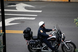 A motorcycle police officer rides confidently through the city, framed by the asphalt and white road markings. The scene conveys a sense of authority and vigilance, with the officer's focused expression reflecting a commitment to duty. Soft, diffused lighting enhances the subdued mood, emphasizing the quiet yet potent presence of law enforcement in everyday urban life.