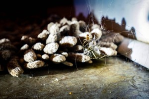 A hauntingly detailed close-up captures a spider ensnaring its prey, suspended in a web among pale, textured debris. The interplay of light and shadow creates a stark, eerie atmosphere, highlighting the intricate threads and the inevitability of nature's cycle. The composition draws the viewer's eye toward the tension of predator and prey, evoking a sense of fascination and unease.