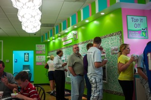 The photograph captures a vibrant self-serve frozen yogurt shop filled with customers enjoying a light-hearted outing. Bright green and pink walls create a lively atmosphere, while the casual, relaxed interactions among patrons add a sense of community and joy. Soft overhead lighting highlights the colorful toppings and enhances the inviting mood of this cheerful space.