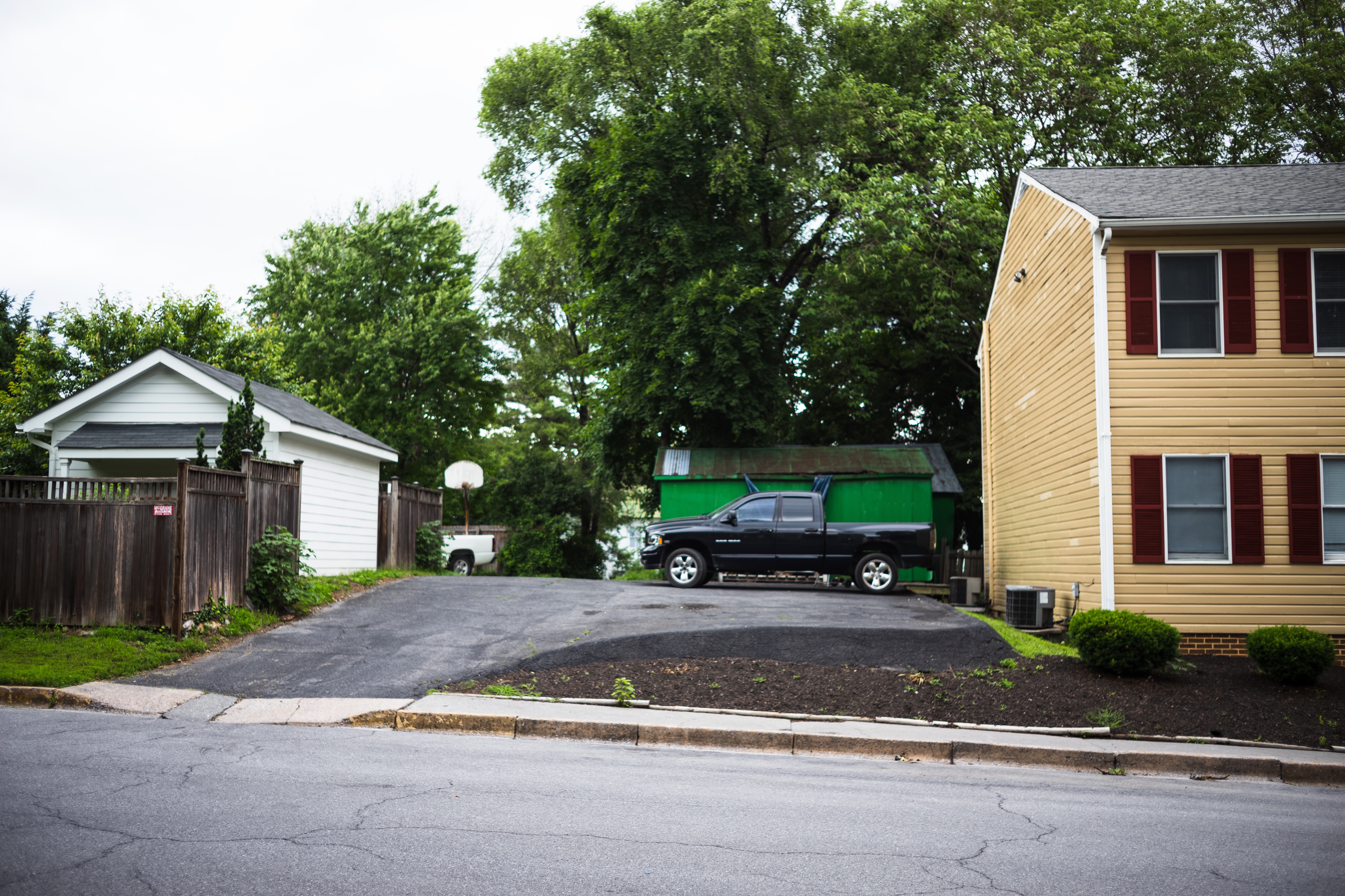 This photograph captures a quiet suburban scene with a yellow house and a nearby gray truck parked on a partially paved driveway. Overcast skies lend a muted mood, while the lush greenery surrounding the area suggests a peaceful, yet somewhat neglected ambiance. The composition emphasizes the contrast between the structured architecture and the natural elements, creating a sense of tranquility mixed with untidy familiarity.