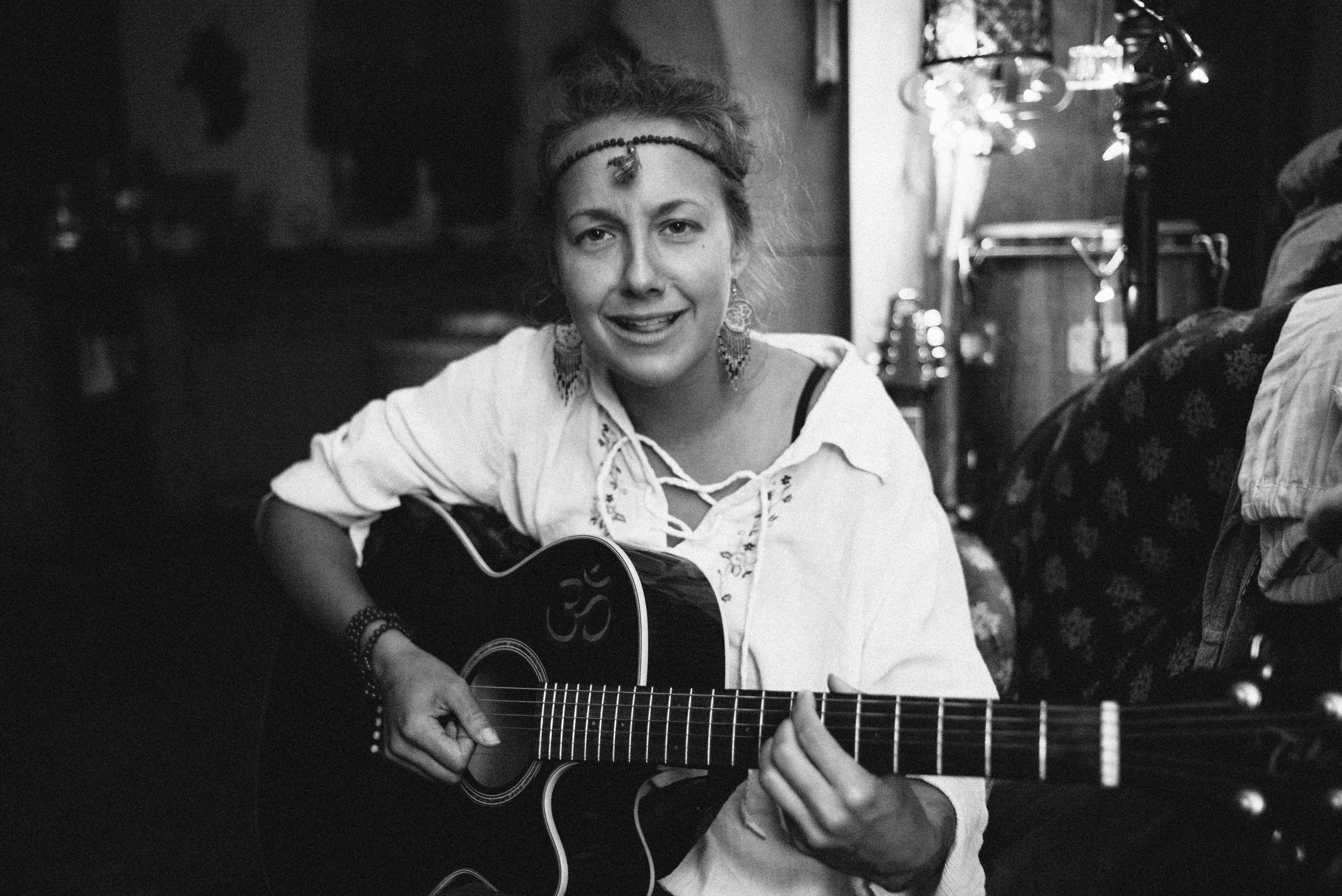 In an intimate setting, a young woman strums her guitar, her serene smile capturing the essence of the moment. The soft black-and-white lighting enhances the cozy atmosphere, while the intricate details of her attire and the surrounding decor add an artistic flair. This photograph evokes a sense of creativity and warmth, inviting viewers into her musical world.