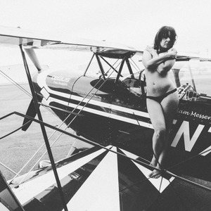 A striking black-and-white photograph captures a woman poised on the wing of a vintage biplane. Her nude form contrasts sharply with the sleek lines of the aircraft, evoking a sense of bold freedom. The muted lighting enhances the raw emotion of the scene, blending vulnerability with an adventurous spirit.