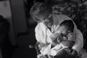 In a cozy, softly lit room, an elderly woman cradles a baby in her arms, nurturing a moment of intimacy and warmth. The monochrome tones enhance the emotions of love and connection, with the gentle smiles exchanged between them highlighting a timeless bond. The blurred background creates an intimate focus on their serene interaction, evoking feelings of nostalgia and comfort.