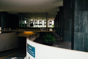 The photograph captures an intriguing interplay of shadow and light within a modern architectural space. A solitary figure is silhouetted against the reflective glass, evoking a sense of solitude amid the urban environment. The composition emphasizes the sleek lines and curves of the structure, while the lush greenery adds a touch of life, contrasting with the stark concrete and glass elements.