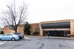 In an almost desolate shopping center, a solitary figure approaches a retail storefront under an overcast sky. The stark, muted colors of the building and gray pavement lend a somber mood, while the leafless trees frame the scene, hinting at the absence of warmth and life. Subtle reflections in the glass and the sparse parking lot reinforce the feeling of emptiness and stillness in this everyday setting.