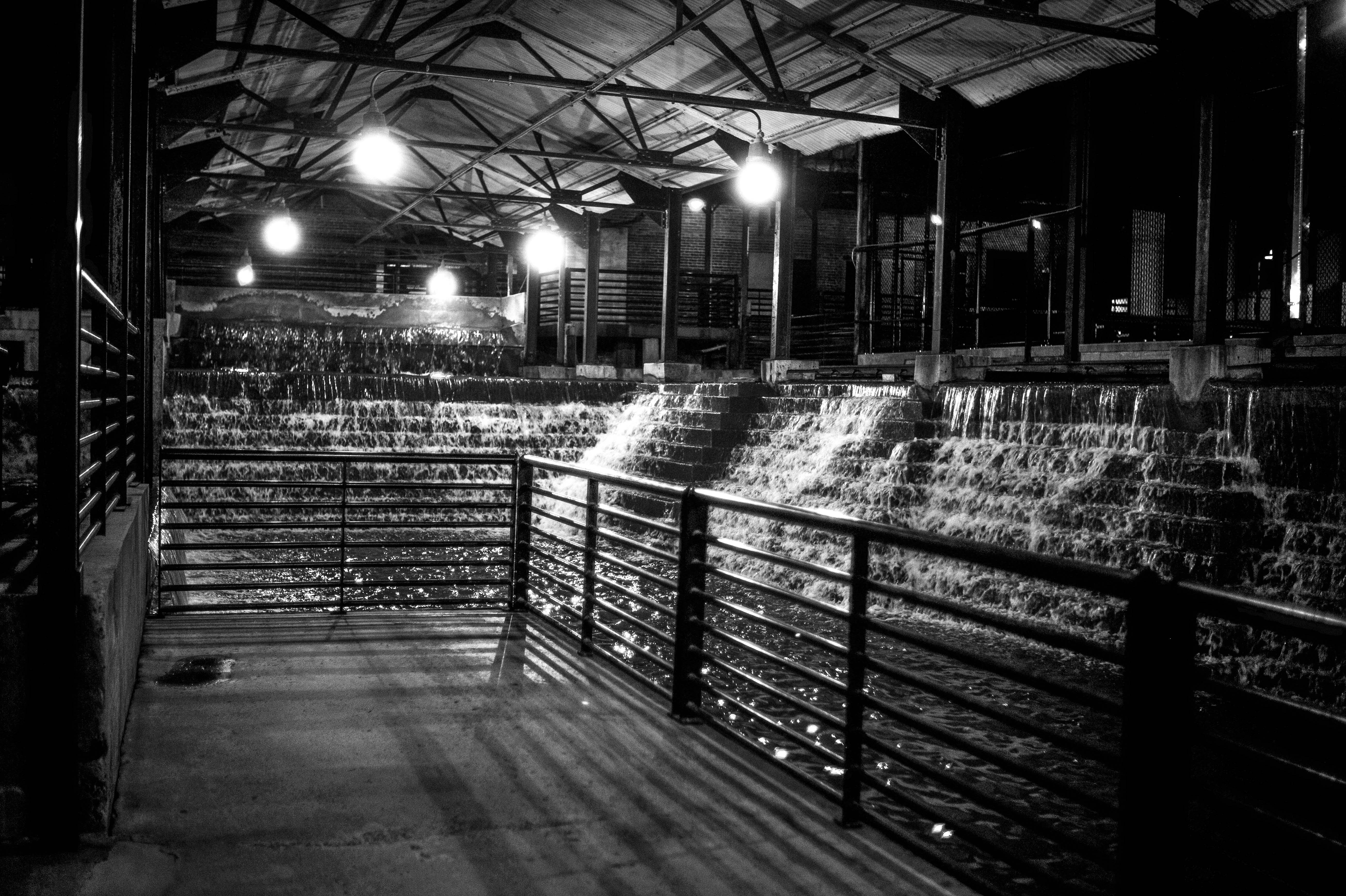 This monochromatic photograph captures the tranquil scene of a cascading waterfall under a dimly lit structure. The interplay of shadows and soft light creates an intimate, reflective mood, while the architecture frames the flowing water, inviting the viewer to ponder the passage of time. The stillness of the water contrasts with the gentle movement of the falls, embodying a serene yet dynamic atmosphere.