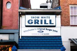 The photograph captures the distinctive facade of the Snow White Grill, exuding a nostalgic charm that harks back to its establishment in 1949. The bold blue and white sign is central to the composition, conveying a sense of welcoming warmth typical of classic American diners, while the surrounding buildings hint at a quaint urban atmosphere. The lighting enhances the inviting feel, making it a perfect spot for burger enthusiasts.