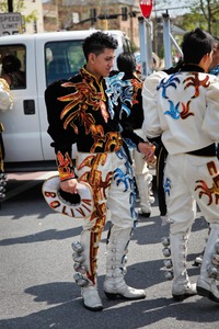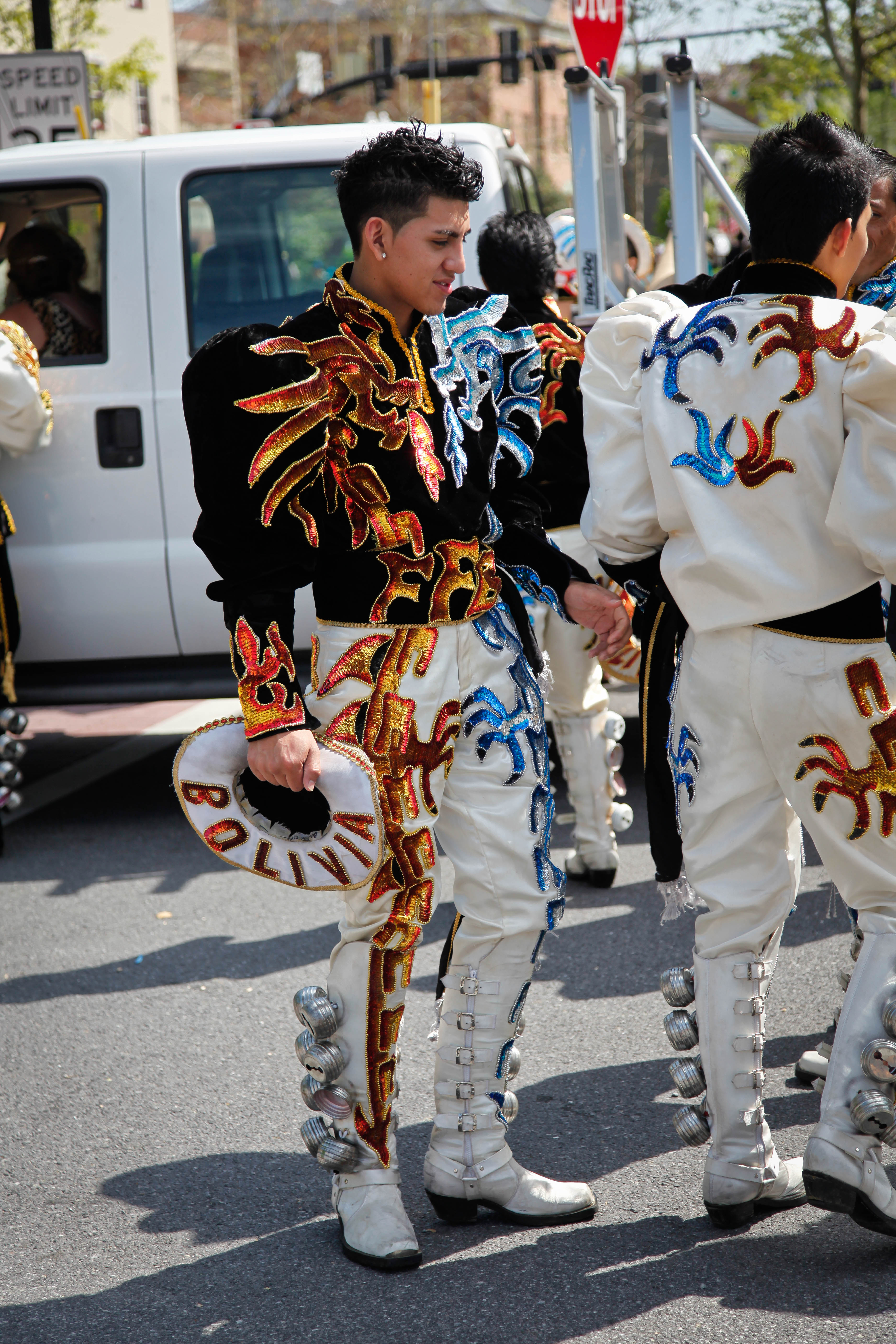 The photograph captures a young man dressed in a striking, ornate costume emblazoned with intricate designs in vibrant colors, reflecting the celebratory mood of a cultural festival. His expression is one of focus and anticipation, as he interacts with fellow performers, while the bright daylight highlights the rich textures of the garments. In the background, a white vehicle and other participants add to the lively atmosphere, evoking a sense of community and tradition.