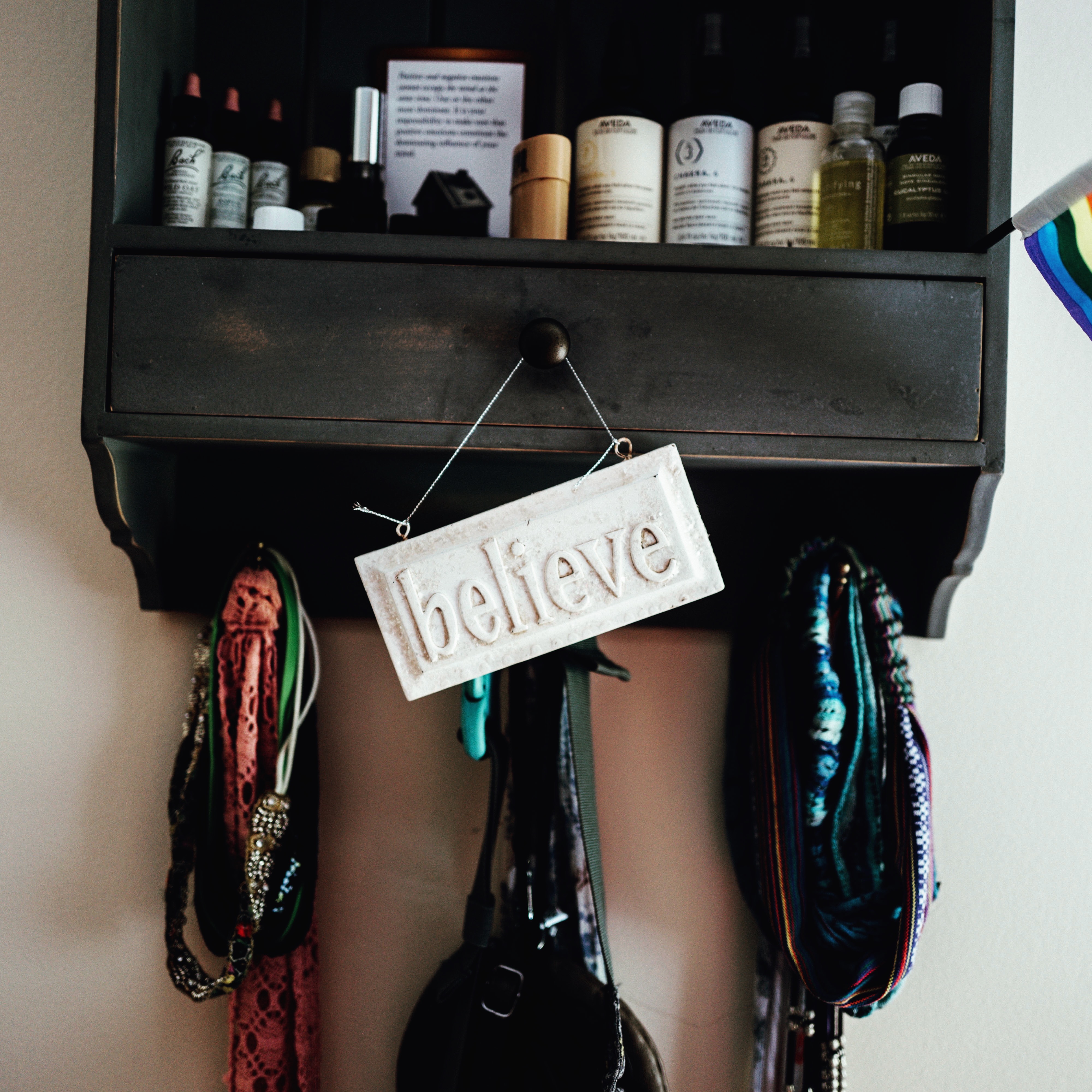 A cozy, intimate corner showcases a wooden shelf adorned with various beauty products, hinting at self-care rituals. The pale 'believe' sign hangs gently, casting an uplifting mood, while the soft, diffused lighting creates a warm ambiance. Colorful accessories dangle below, adding a vivid touch to this sanctuary of positivity.