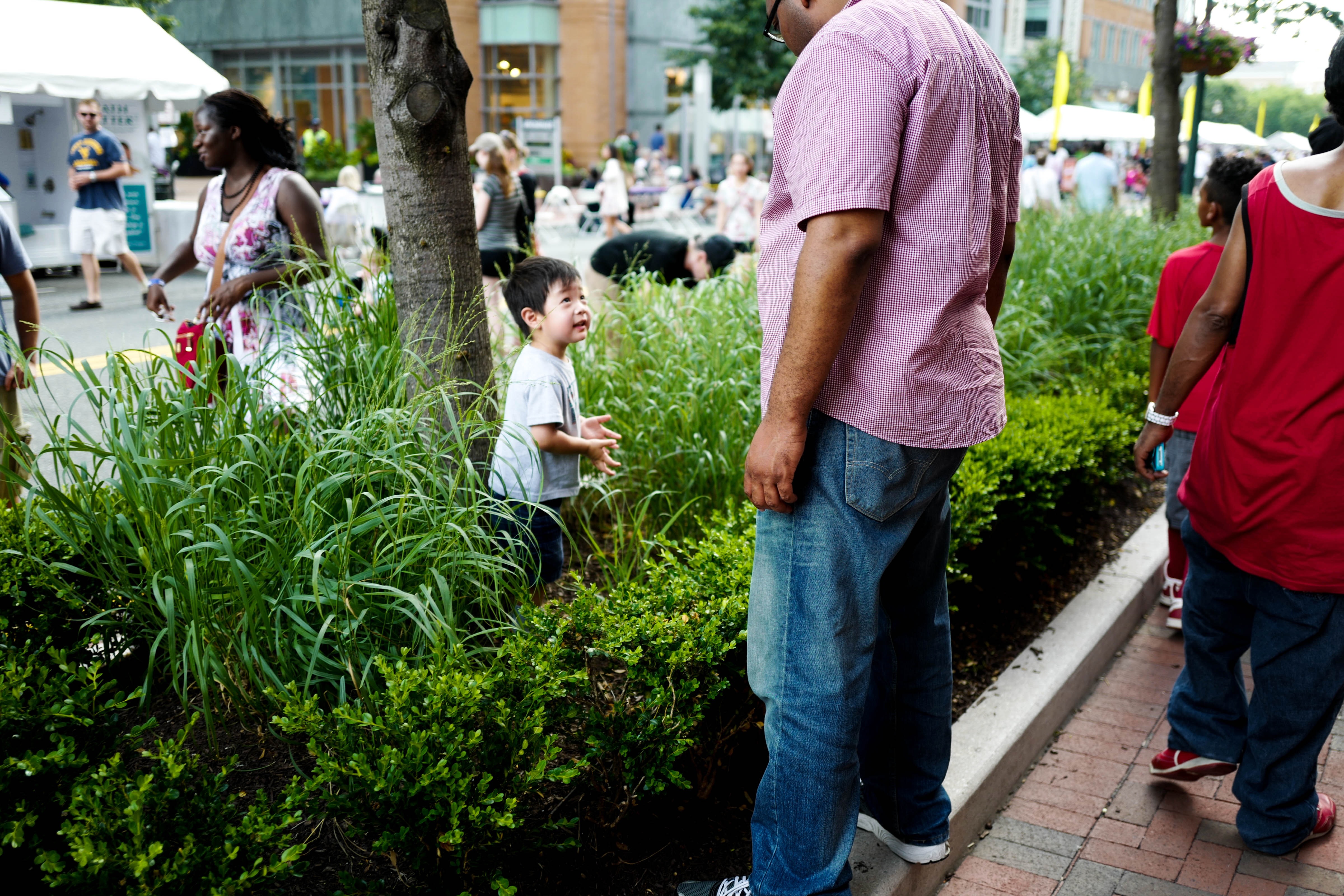 In a bustling street fest, a young boy peeks out from behind lush greenery, his face lit with excitement and curiosity. The warm afternoon light bathes the scene, highlighting the vibrant colors of the surroundings and the diverse crowd moving about. This candid moment captures the innocence of childhood amidst the lively atmosphere of community and celebration.