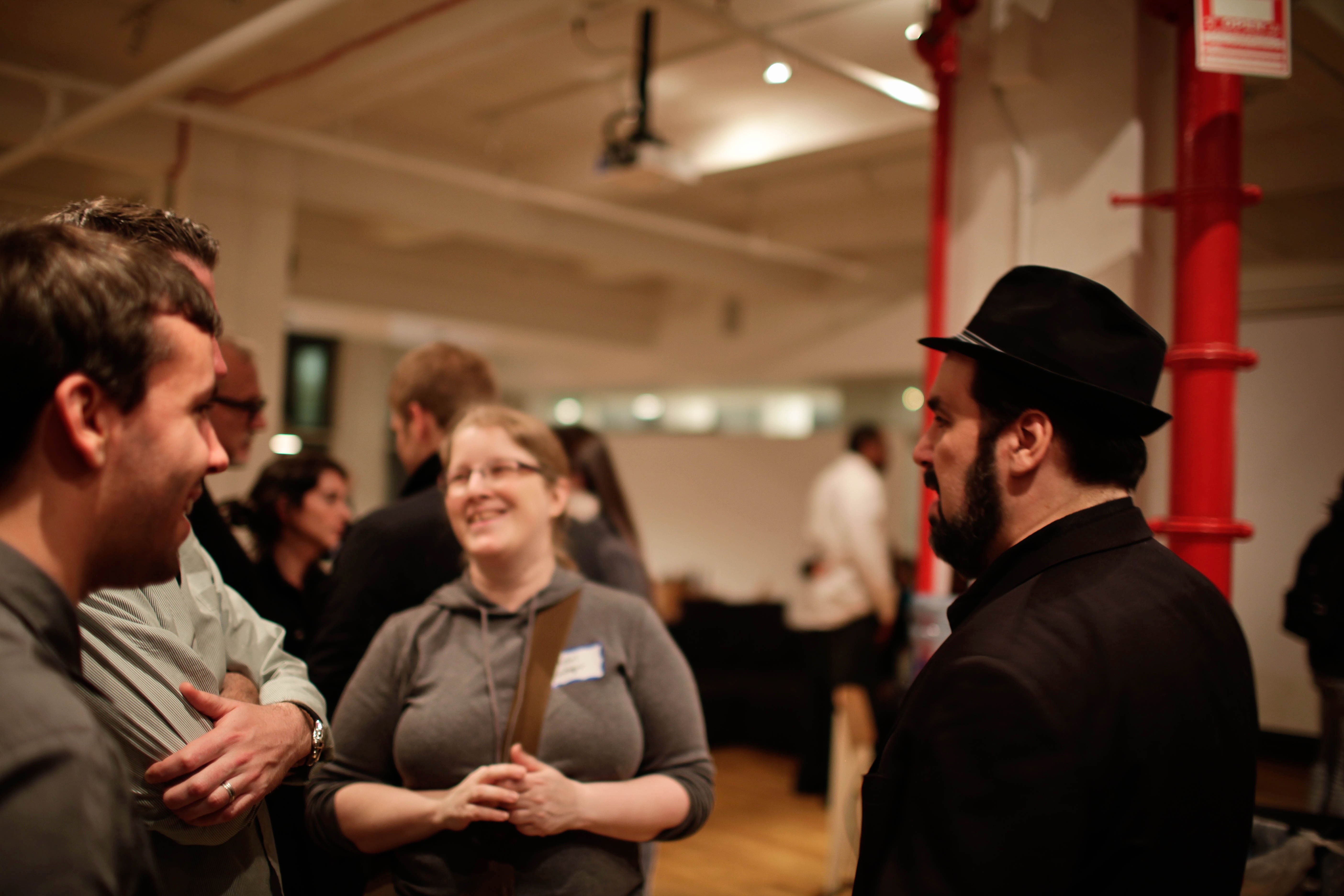 This photograph captures a lively moment at a social gathering, filled with engaged conversations. The warm, ambient lighting creates an inviting atmosphere, highlighting the smiles and expressions of those interacting. Focused on a small group, the composition conveys a sense of connection amidst a busy backdrop of people.