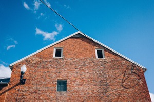 The photograph captures the rugged façade of a brick building against a brilliant blue sky, emphasizing its character and history. The stark contrast between the warm tones of the bricks and the cool hues of the sky creates a serene yet powerful mood. An overhead power line adds a hint of modernity to this timeless structure, enriching the composition with layers of context.