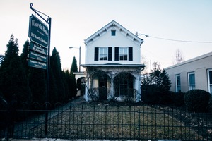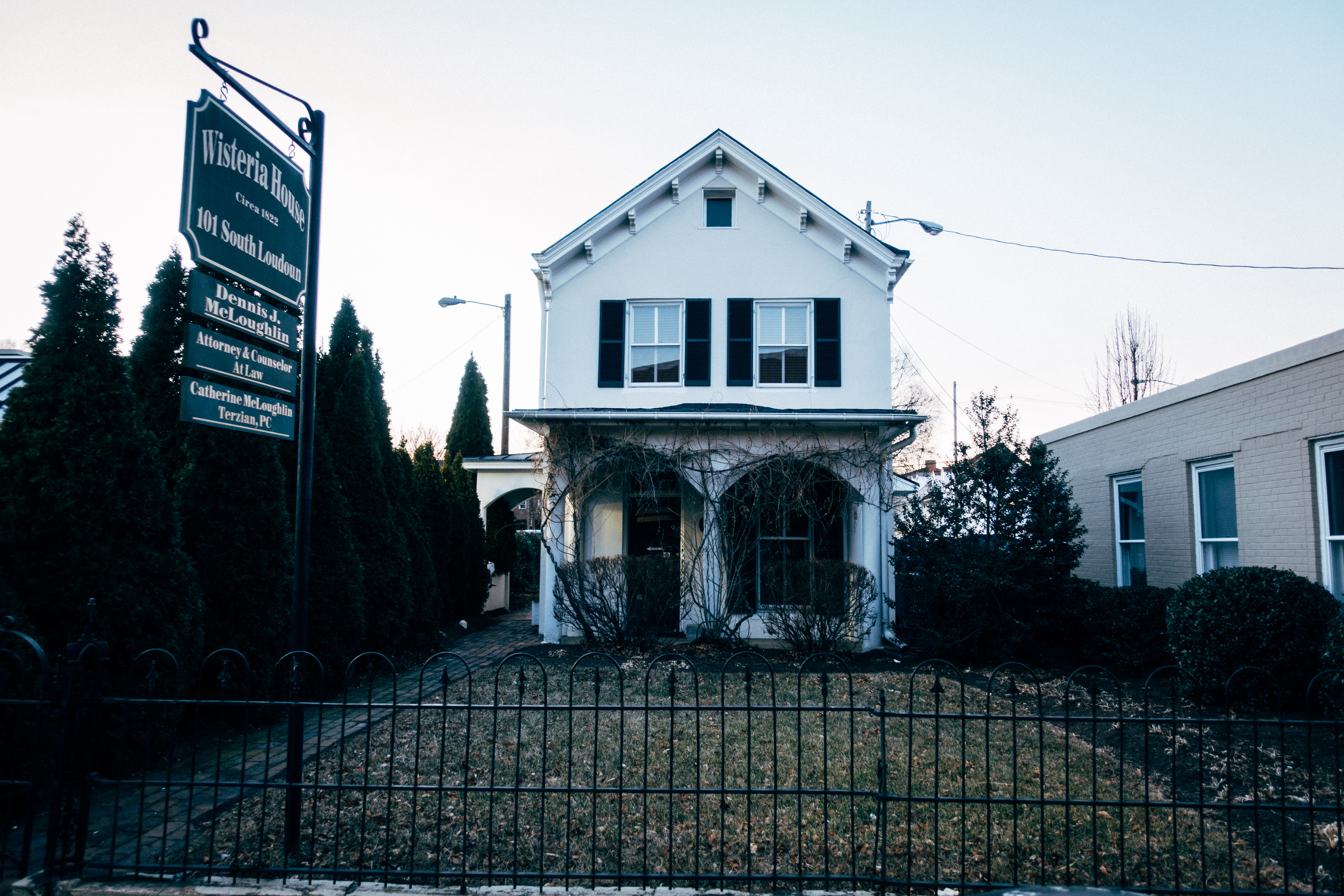 A charming yet somber house stands quietly against a pale blue sky, framed by dark green hedges that enclose the yard. The muted tones and careful lighting create an introspective mood, hinting at stories long forgotten behind the closed windows. A wooden sign labeled 'Wisteria House' adds a touch of historical allure, drawing the viewer's eye to its once-inviting façade, now cloaked in stillness.