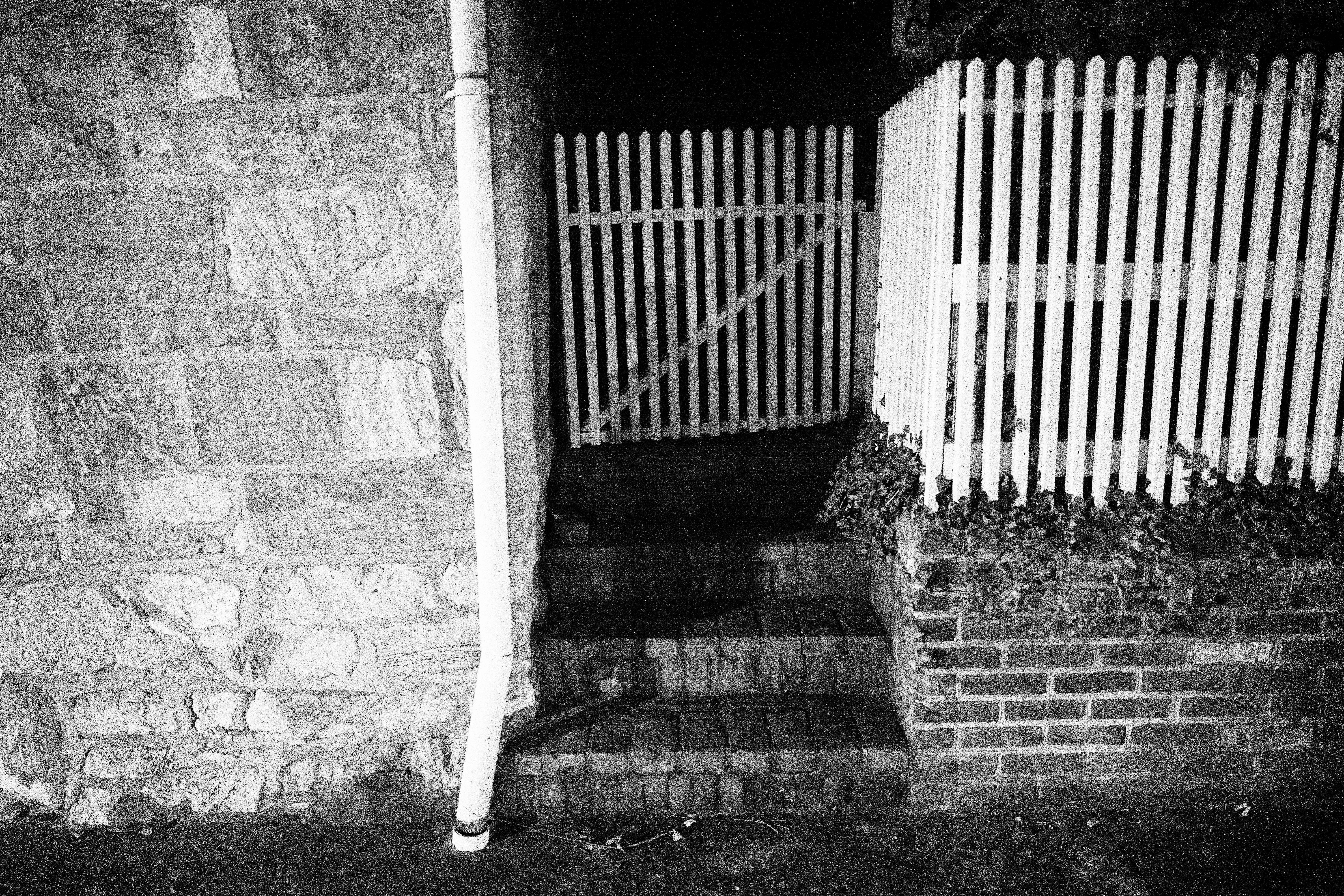 This photograph captures a shadowy entrance, framed by weathered stone and stark white fencing, evoking a sense of mystery. The subdued lighting lends an eerie atmosphere, while the stark contrasts enhance the textures of the surfaces. The composition draws the viewer's eye upward, inviting curiosity about what lies behind the inviting yet ominous gate.