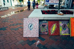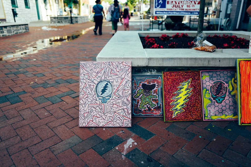 This vibrant photograph captures a collection of eye-catching artworks displayed on a brick sidewalk, with colorful designs featuring intricate patterns and whimsical characters. The scene is lively, filled with people strolling by in the background, while the soft, natural light highlights the textures and colors of the paintings. The gentle play of light creates a welcoming, artistic atmosphere, inviting passersby to appreciate the creativity on display.