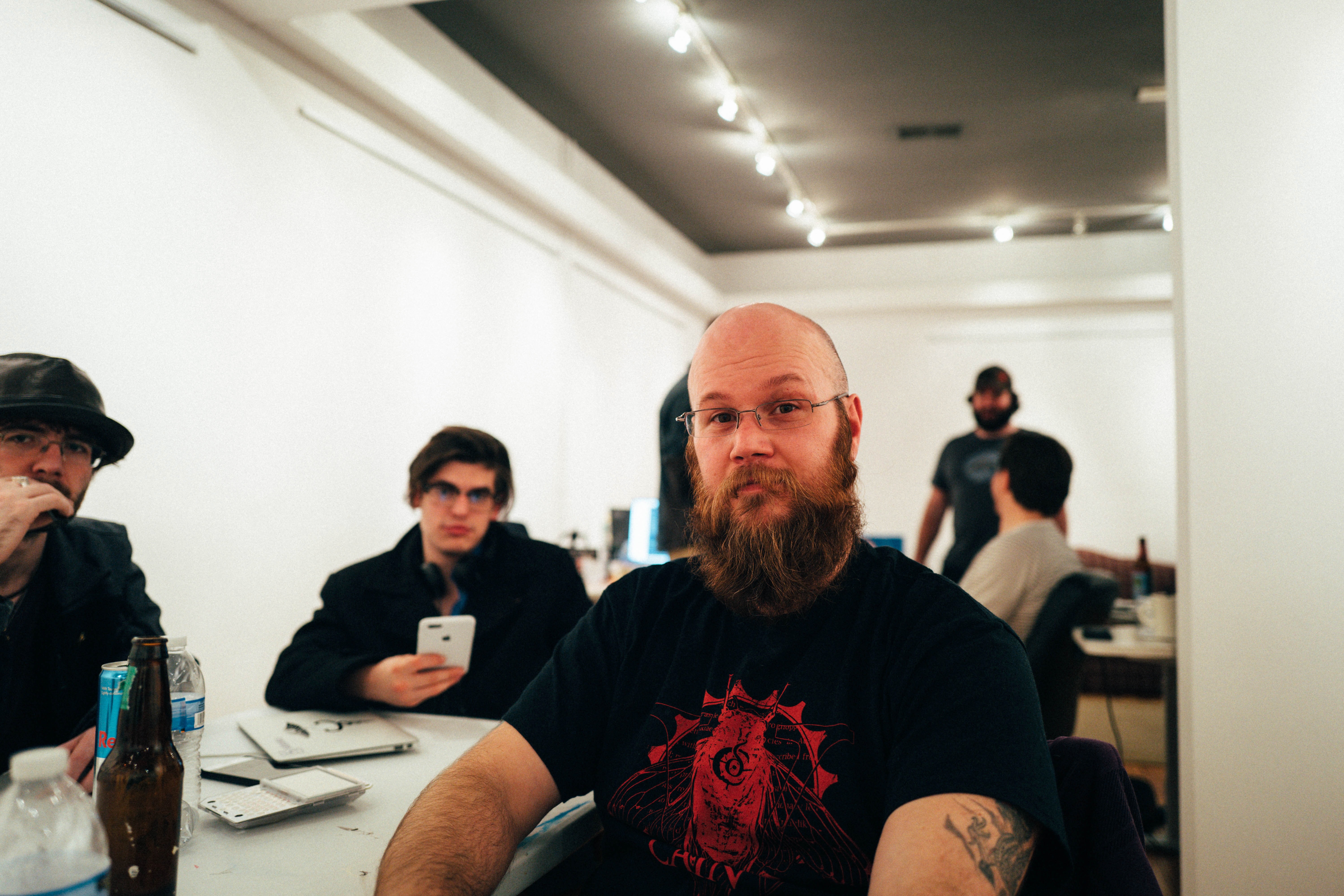 In a dimly lit room, a group of men engage in various activities, their expressions ranging from pensive to relaxed. The bearded subject in the foreground, with a sharp gaze, contrasts against the soft background of softly illuminated figures, creating an intimate yet dynamic atmosphere. Sparse lighting highlights their features, adding depth to the scene while emphasizing a sense of shared camaraderie amidst focused conversations.