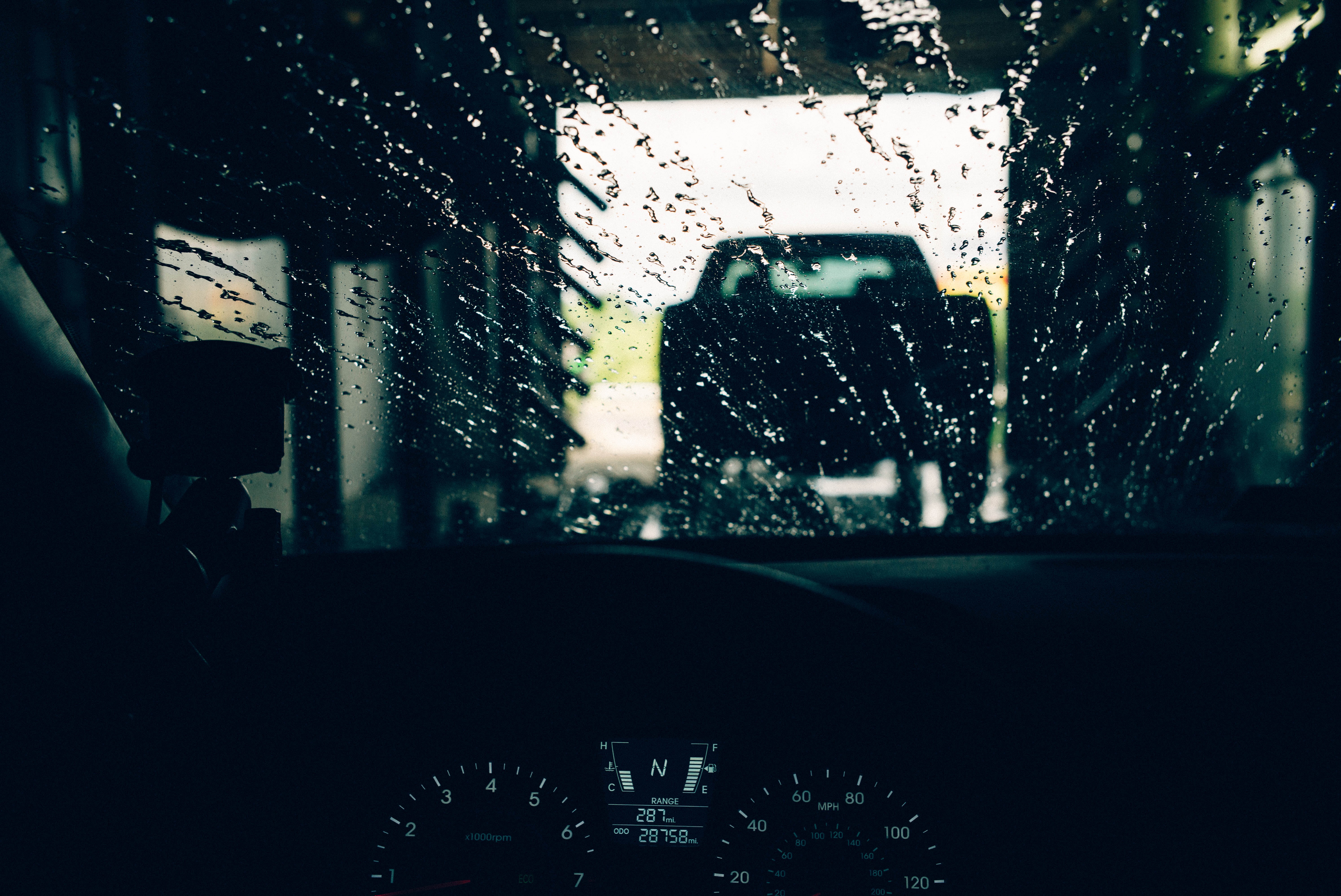 This photograph captures a moment from inside a car wash, with droplets of water cascading against the windshield, creating a blurred, abstract effect. The dark silhouette of the vehicle in the distance contrasts with the soft, diffused light filtering through the wash, evoking a sense of tranquility amid the mechanical process. The composition draws the eye toward the out-of-focus scene beyond, inviting contemplation on the simplicity and routine of everyday moments.