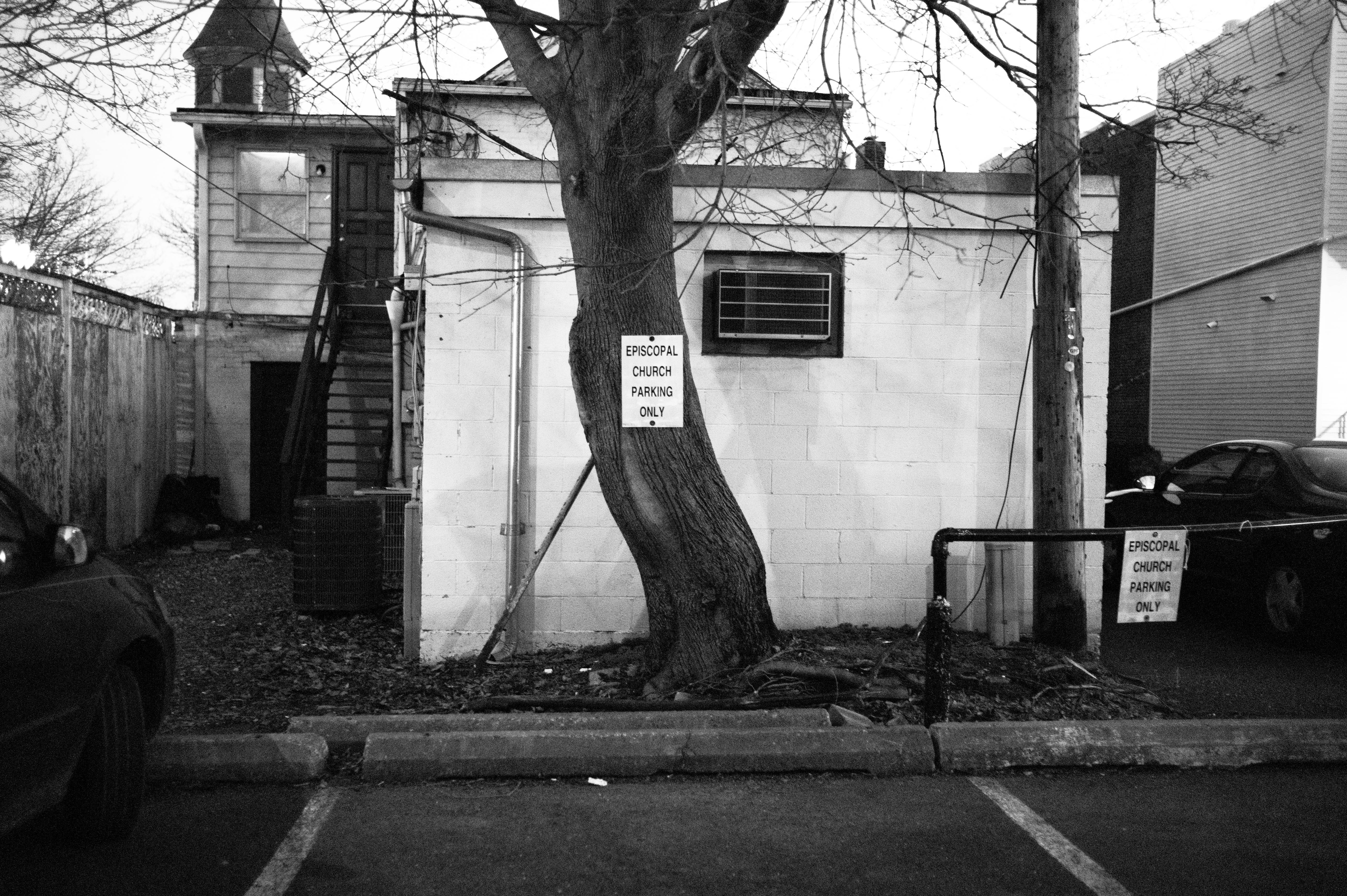 This black and white photograph captures a seemingly forgotten corner of a church parking lot, dominated by a weathered tree that leans against a stark white wall. The mood is somber and introspective, enhanced by the sparse surroundings and minimal lighting that casts long shadows. The signage, stark and authoritative, hints at the space's intended purpose while contrasting with the organic forms of nature encroaching upon rigid manmade structures.