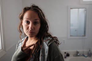 The photograph captures a young woman in a bathroom, embodying a blend of confidence and nonchalance. Soft, natural light floods through the window, illuminating her expressive face and slightly tousled hair. The minimalist background enhances the focus on her bold pose and piercing gaze, creating an intimate yet powerful mood.