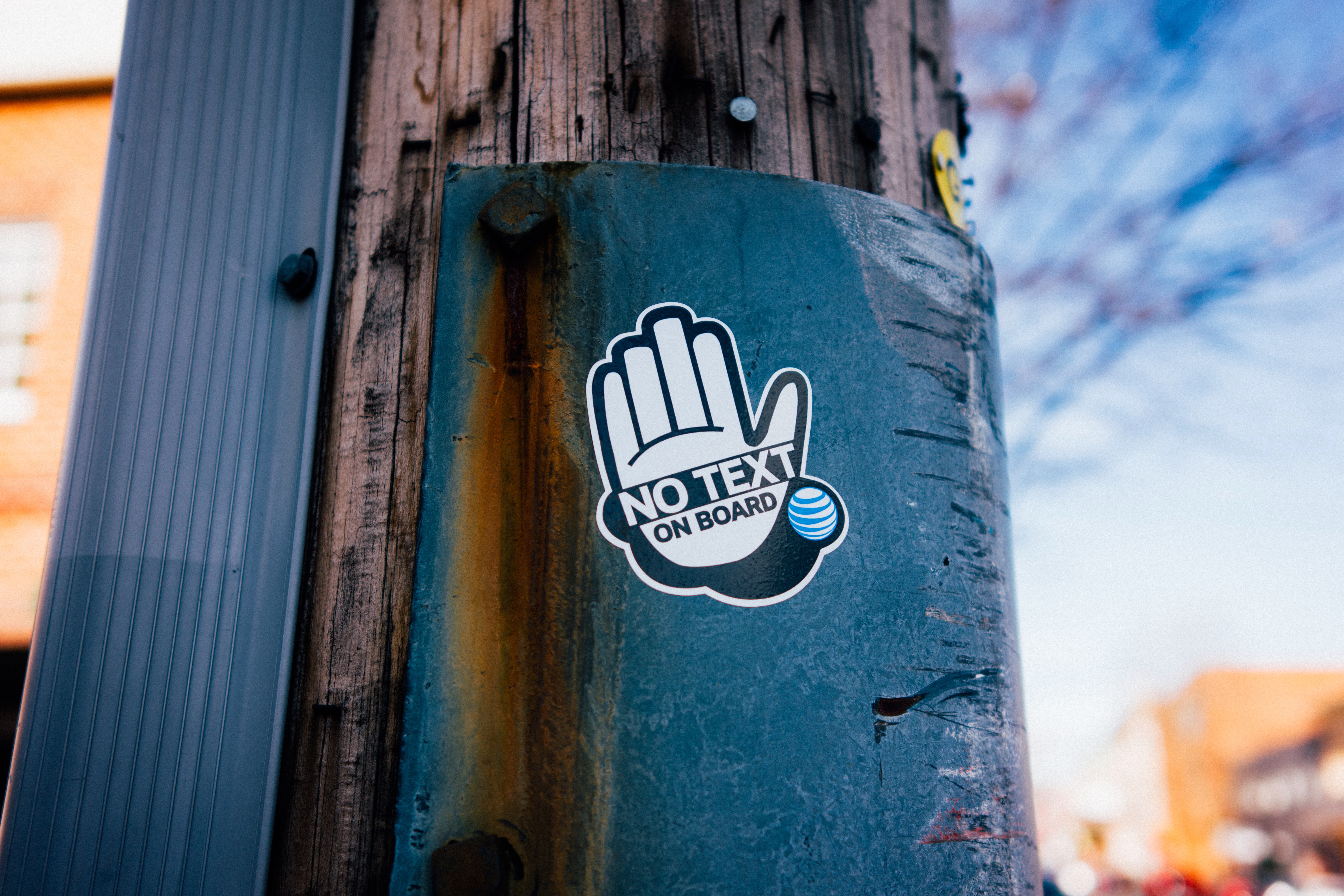 This photograph captures a close-up of a sticker affixed to a weathered wooden utility pole, featuring a hand symbol with the message 'NO TEXT ON BOARD'. The vibrant colors and sharp focus on the sticker contrast strikingly against the rustic background, evoking a sense of urgency and caution amidst the mundane setting. Soft natural lighting accentuates the textures of the pole, enhancing the mood of the composition.