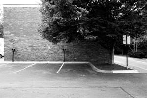 In this stark black-and-white composition, a barren parking lot stands juxtaposed with a tall brick wall and a solitary tree. The muted tones enhance the mood of desolation, while the positioning of the light poles adds a sense of symmetry and stillness. The overall aesthetic evokes introspection, capturing the beauty in simplicity and isolation.