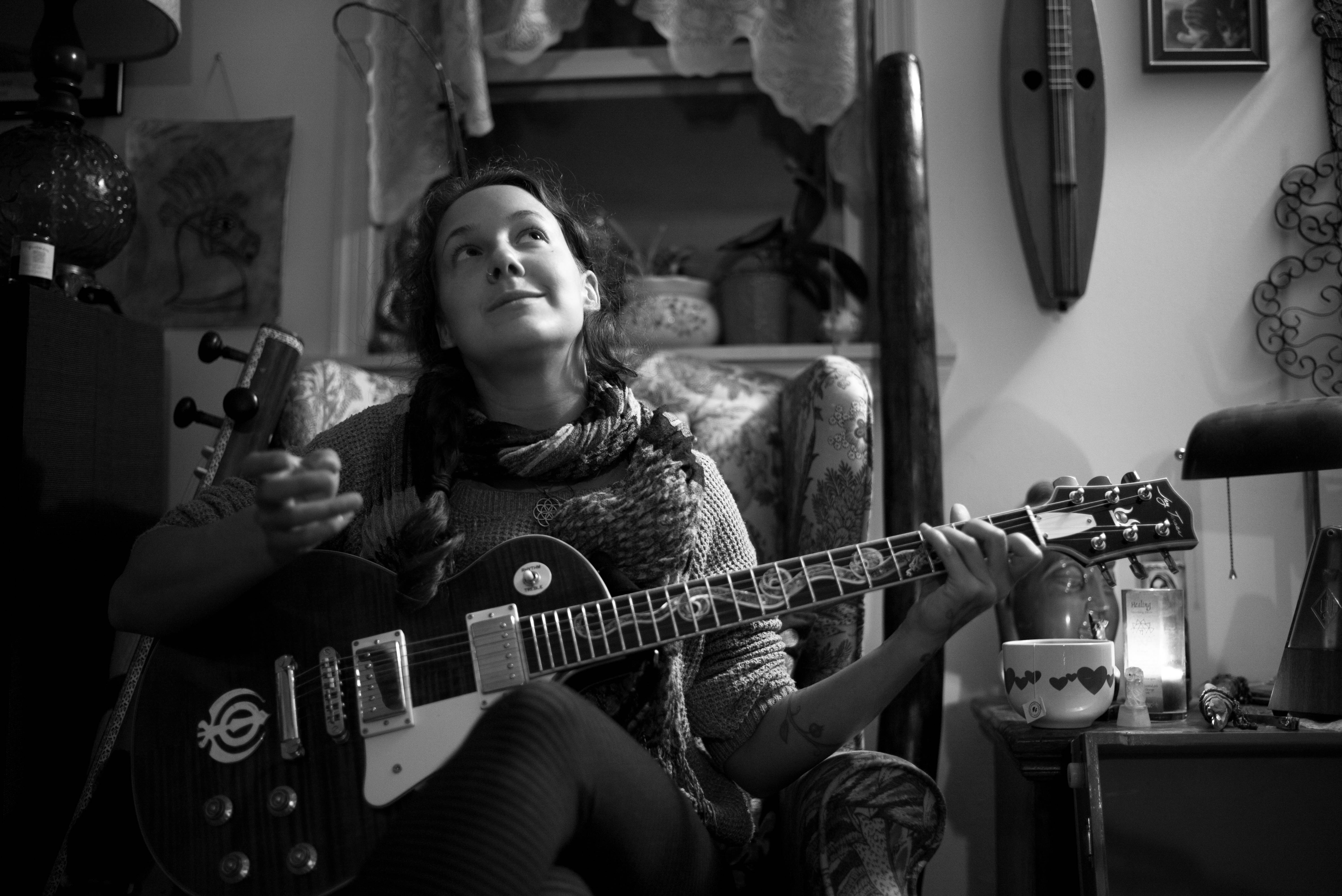 In this intimate black-and-white photograph, a woman sits comfortably in a patterned armchair, cradling an electric guitar. Her contemplative expression suggests a moment of inspiration amidst a cozy, eclectic atmosphere filled with curiosities. Soft lighting highlights her features and the texture of her knitted sweater, enhancing the serene yet creative mood of the scene.
