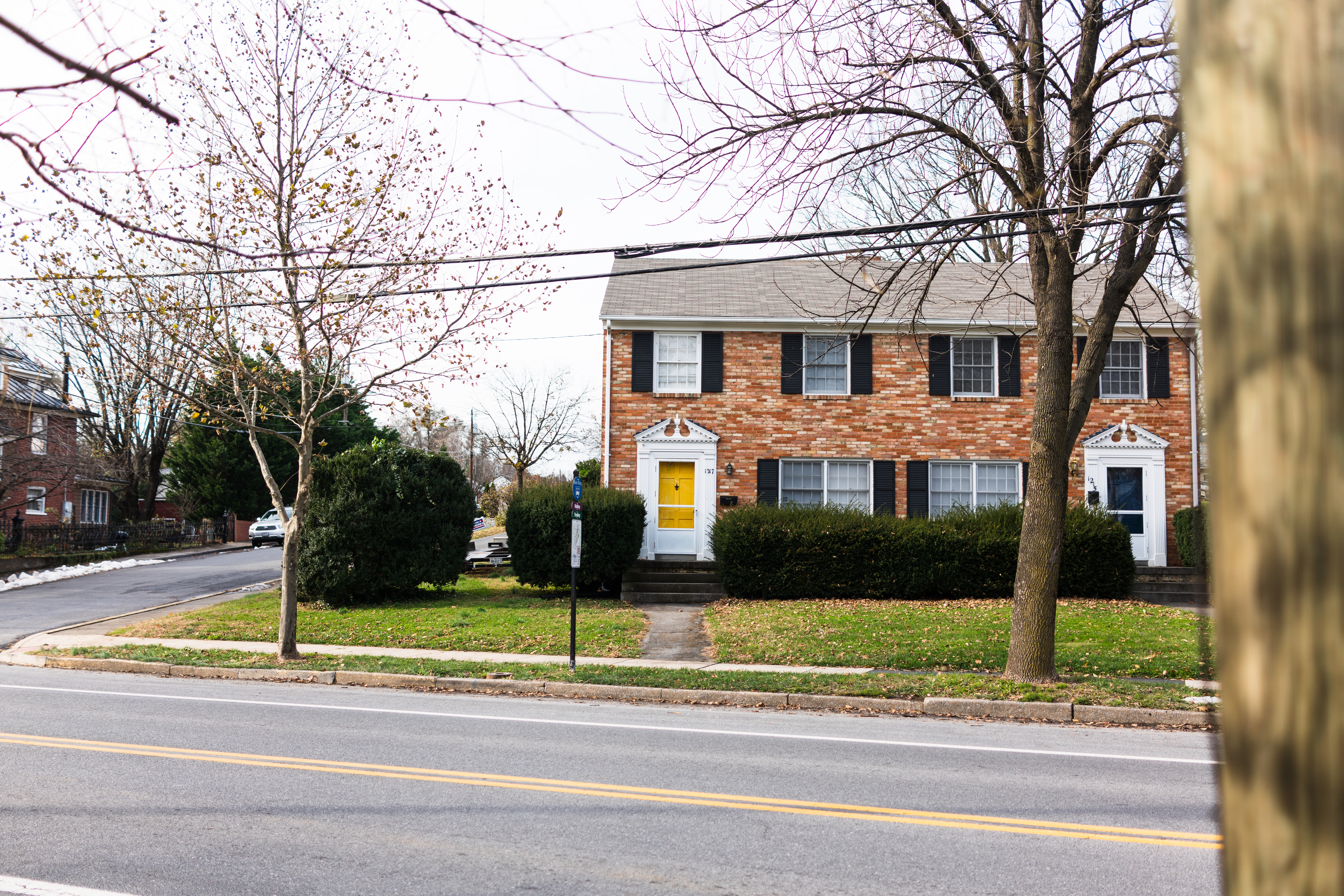 A quaint brick duplex stands amid the fading autumn landscape, its warm yellow door providing a pop of color against the subdued tones of the neighborhood. The composition is framed by tree branches and power lines, giving an intimate yet slightly detached view. Soft, diffused light enhances a sense of calm and nostalgia, evoking the charm of suburban life.