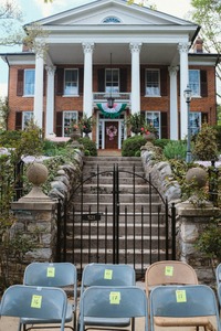 This photograph captures a stately old mansion, framed by lush greenery and vibrant flowers, inviting a sense of timeless elegance. The mood is poised and celebratory, emphasized by the meticulously arranged chairs lined up in front of the grand entrance, which hints at an upcoming event. Soft natural light bathes the scene, enhancing the warm brick tones and the inviting details of the architecture.