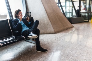 A solitary man lounges in an airport terminal, absorbed in his phone as he waits for his flight. The sleek, modern architecture and soft, natural light enhance the atmosphere of tranquil anticipation, while the polished floor reflects his poised demeanor. His casual yet polished attire suggests a blend of business and leisure, capturing the essence of contemporary travel.