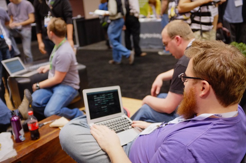 In a bustling conference environment, two individuals sit engrossed in their laptops, embodying the spirit of concentration amidst the energetic backdrop of attendees. The warm lighting and soft focus evoke a sense of calm, contrasting with the lively movement of people surrounding them. Their relaxed postures and coding screens suggest a blend of creativity and productivity in a tech-savvy atmosphere.