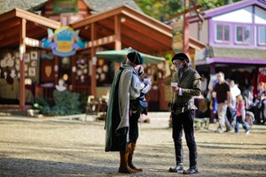 Two elegantly dressed figures engage in conversation at a lively medieval fair, surrounded by vibrant stalls and a bustling crowd. The warm, dappled sunlight lends a soft glow to the scene, enhancing the festive atmosphere. Their costumes reflect a rich historical theme, creating a captivating moment of camaraderie amid the fair’s colorful backdrop.