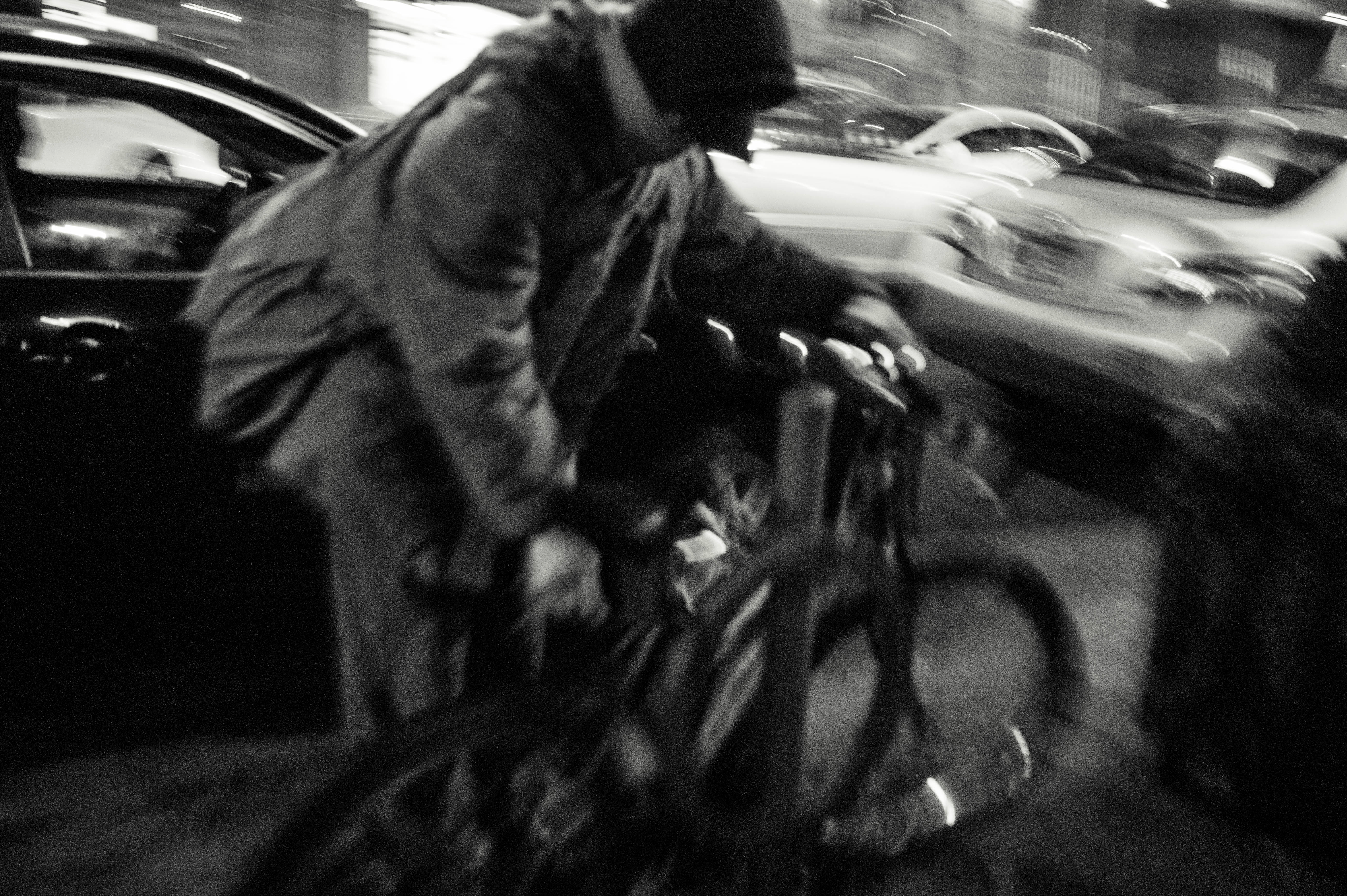 In a blur of black and white, a figure dressed in dark clothing hunches over a bicycle, juxtaposed against the backdrop of bustling traffic. The motion creates a sense of urgency and anonymity, capturing the gritty essence of urban life at night. Dim lighting and a sense of movement evoke a feeling of solitude amidst the chaos of city streets.
