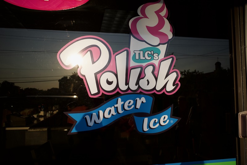The photograph captures a storefront window featuring a vibrant, colorful sign for 'TLC's Polish Water Ice.' The warm golden light of the setting sun reflects off the glass, creating a nostalgic and inviting mood that beckons passersby to indulge in a refreshing treat. Silhouettes of people linger in the background, enhancing the lively atmosphere of a summer evening.