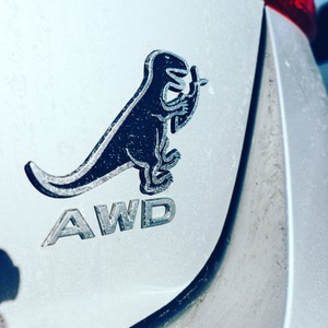 A close-up of a weathered car badge featuring a playful dinosaur design, clutching a small object in its tiny hands. The gritty texture and dust add a touch of rugged charm, while the bold black silhouette contrasts sharply against the silver background, evoking a sense of whimsy and nostalgia. The natural lighting accentuates the details, giving the emblem a lively yet subtle presence.