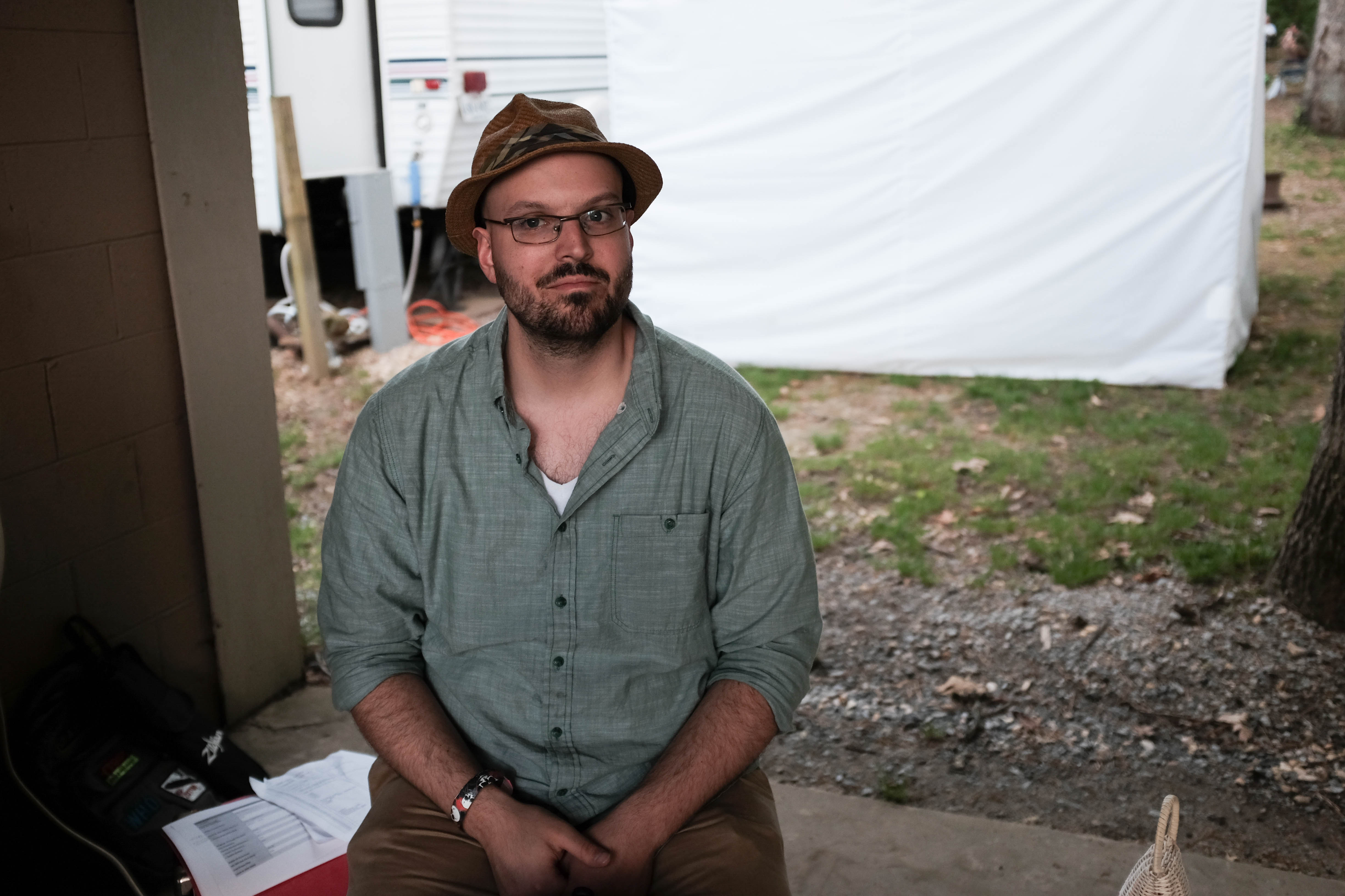 A man sits peacefully, exuding a calm and contemplative mood. Dressed in a light-colored shirt and a casual hat, he gazes thoughtfully at the camera, framed by natural surroundings that blur softly into the background. The subdued lighting enhances the relaxed atmosphere, suggesting a quiet moment of reflection amid the outdoor setting.