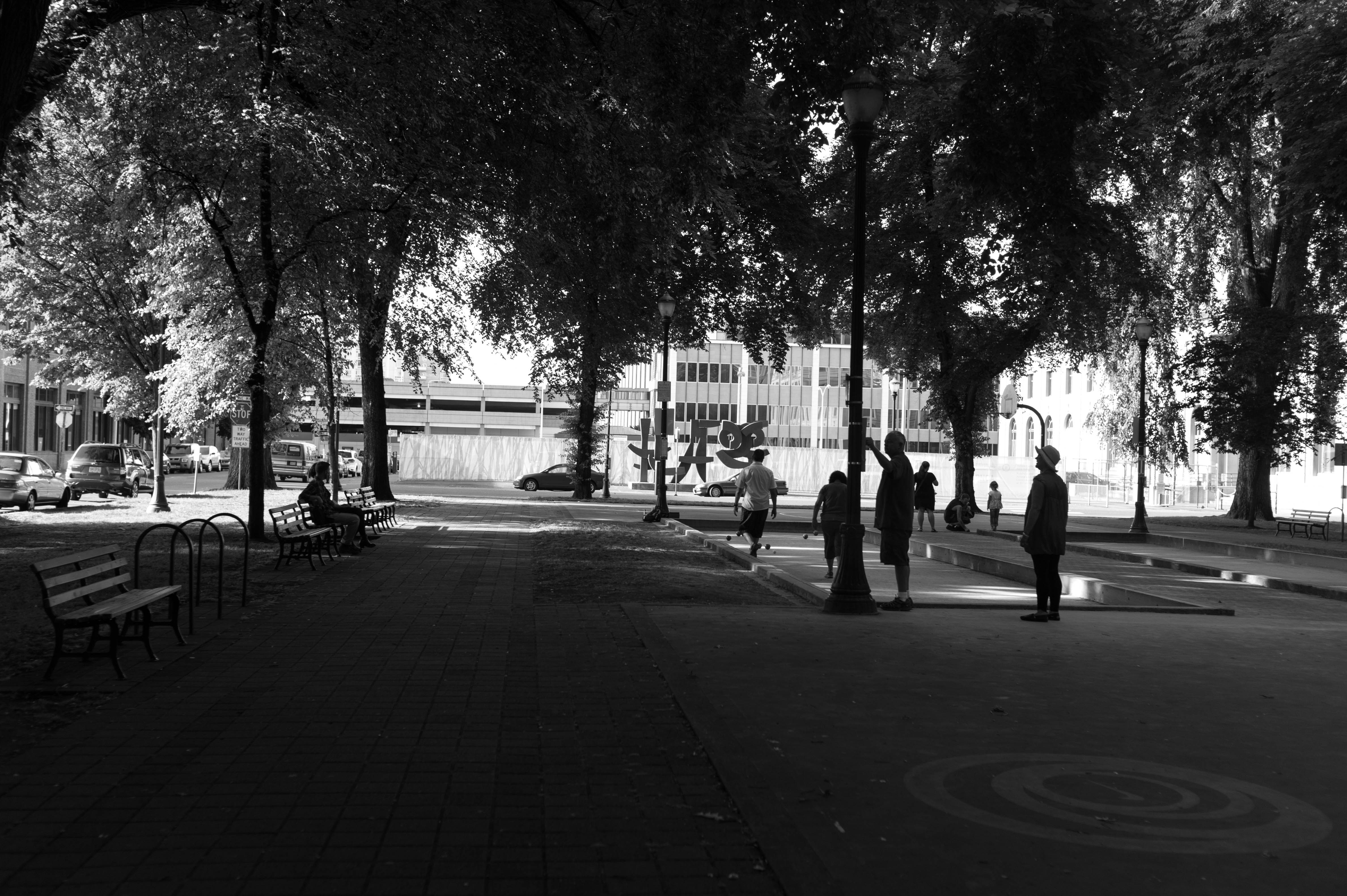 This black-and-white photograph captures a serene urban park scene, where figures stand amidst dappled light and deep shadows created by the overhanging trees. The composition balances the loneliness of empty benches with the activity of passersby, evoking a sense of quiet contemplation in an urban oasis. The stark contrast of light and shadow enhances the mood, giving the scene a timeless feel.