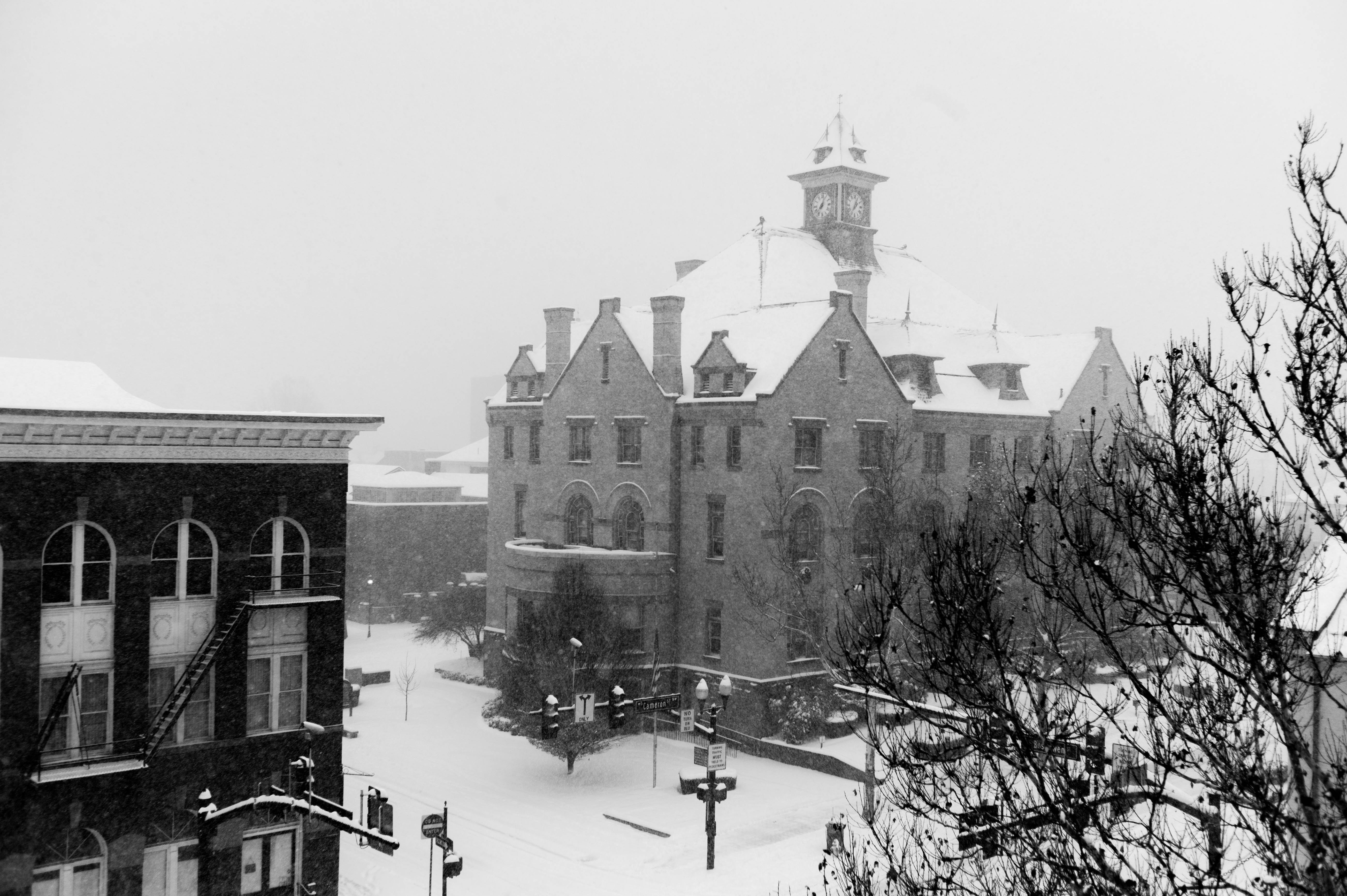 This monochromatic photograph captures a historic building shrouded in a heavy snowfall, evoking a sense of tranquility and solitude. The soft, diffused light enhances the ethereal mood, while the stark contrast between the dark brick structure and the white snow creates a dramatic visual impact. Sparse details emerge through the swirling flakes, suggesting a quiet, almost timeless atmosphere in the heart of winter.