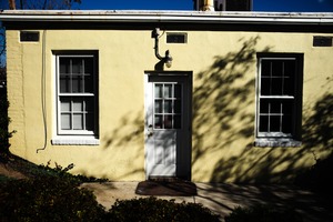 This photograph captures a quaint, yellow stucco wall of a building, centered around a white door framed by symmetrical windows. Shadows play across the facade, evoking a sense of serene isolation amidst the vibrant hues. The bright sunlight highlights the texture of the wall while casting delicate patterns, creating a warm yet introspective mood.