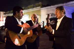 Three musicians clad in formal attire passionately play their guitars against a softly lit night backdrop. The warm glow from the streetlights dances across their faces, capturing a moment filled with camaraderie and emotional resonance. Shadows play around them, enhancing the intimate atmosphere of a nighttime serenade.