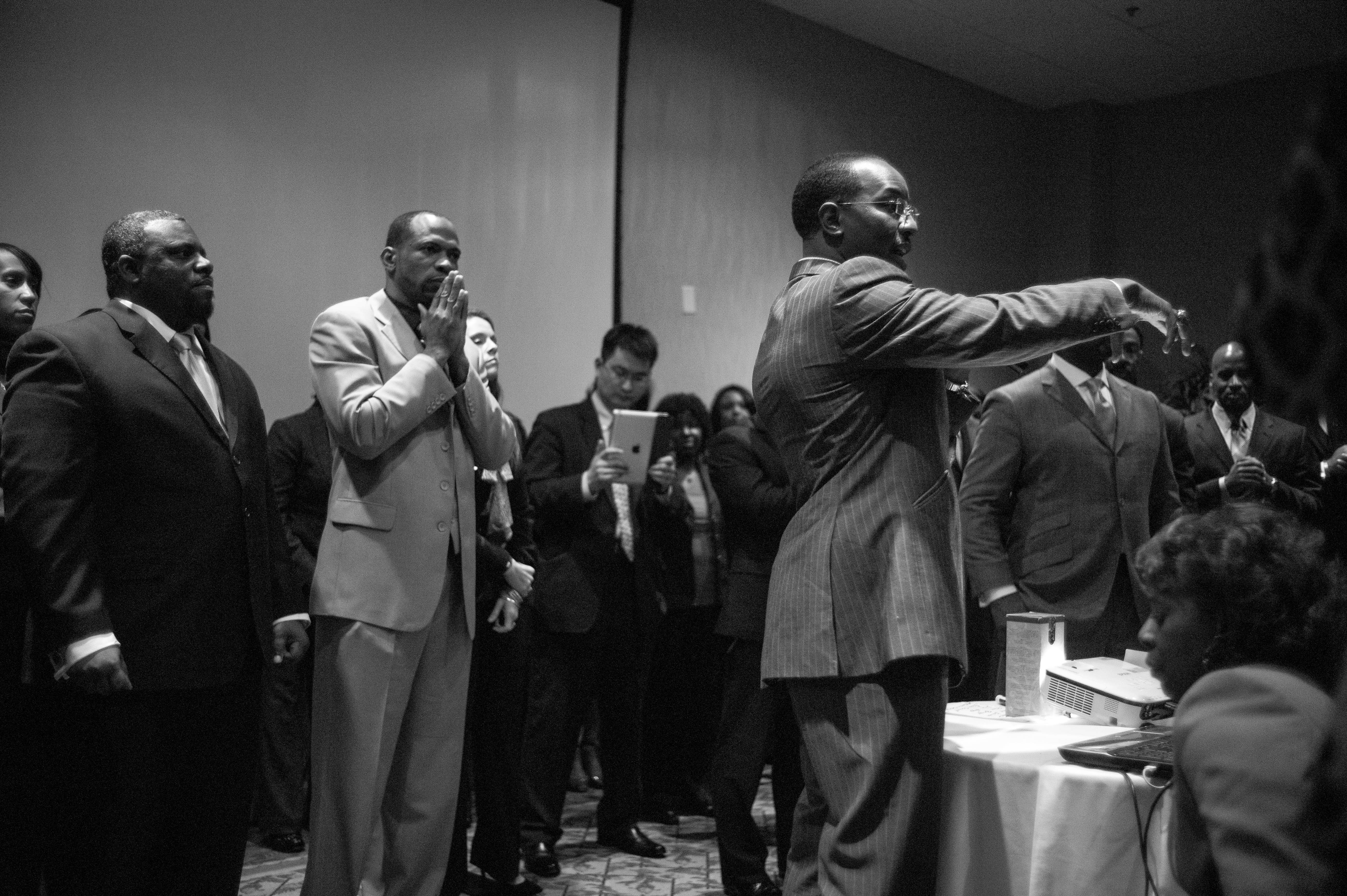 In a dimly lit conference room, a well-dressed speaker gestures passionately, commanding the attention of an attentive audience. The expressions of the listeners range from concern to engagement, all encapsulated in a dramatic monochrome palette that amplifies the atmosphere's tension. The composition draws the eye towards the speaker, emphasizing the weight of the moment and the collective focus of the crowd.