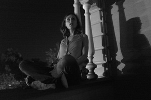 The photograph captures a young woman seated on a ledge, her expression filled with a mix of contemplation and surprise. Soft, ambient light casts delicate shadows, creating a haunting atmosphere that enhances the mystery of the night. The contrast between the illuminated subject and the dark surroundings evokes a sense of solitude and introspection.