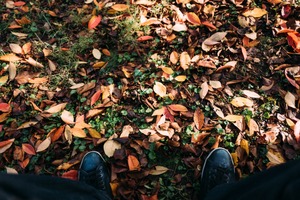 This photograph captures a serene moment in nature, focusing on a carpet of vibrant autumn leaves blanketing the ground. The light filtering through the trees casts gentle shadows on the colorful foliage, evoking a sense of tranquility and reflection. The viewer's perspective, with a pair of black shoes at the bottom, invites a personal connection to the beauty of the season.