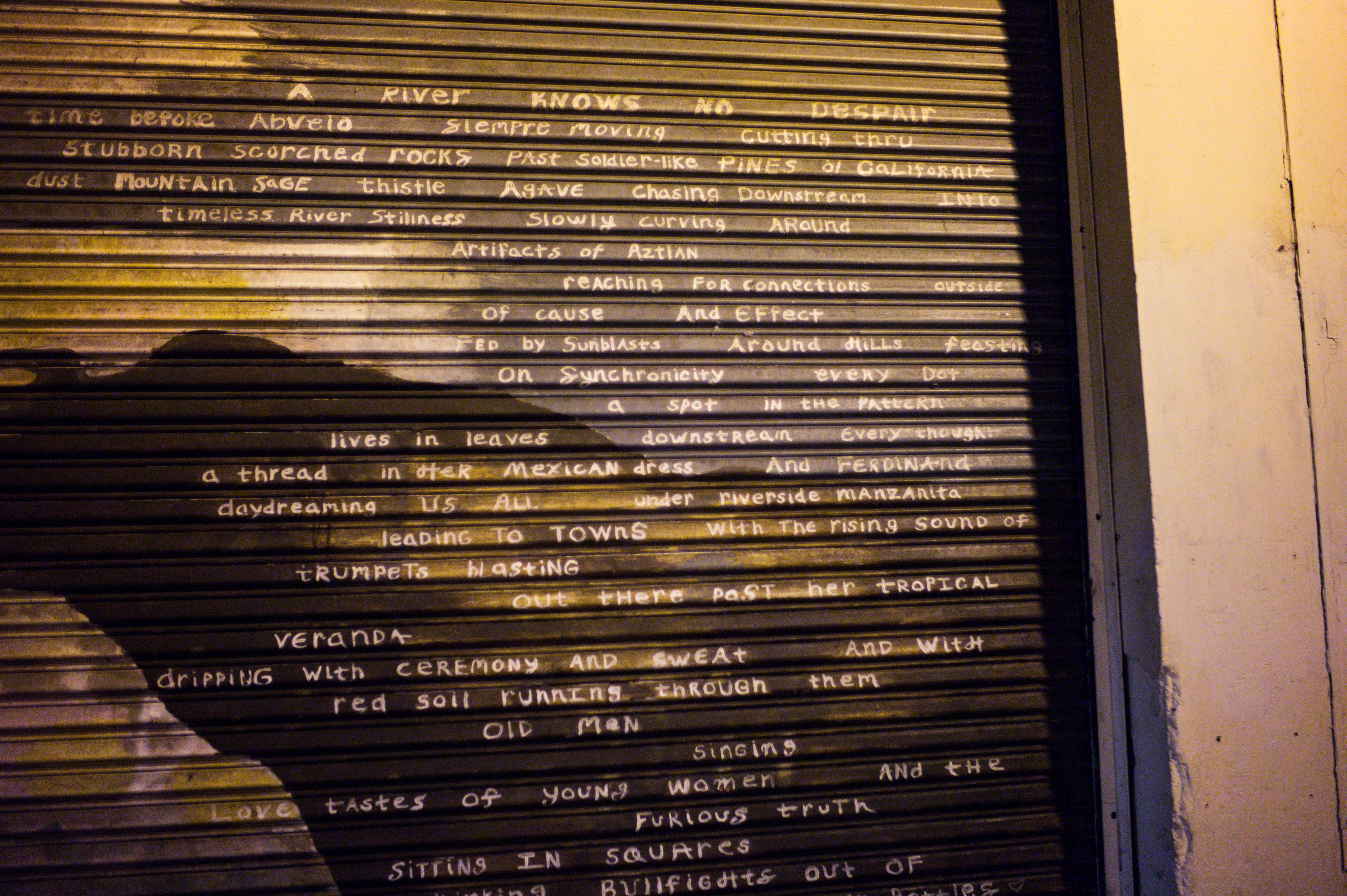 This photograph captures a metal shutter adorned with poetic white text, evoking a sense of contemplative nostalgia. The soft, ambient lighting enhances the intimate mood, inviting viewers to linger over the words that reflect on nature and human connection. The composition blurs the line between urban life and artistry, suggesting a rich story hidden within its lines.