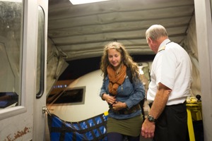 A young woman, casually dressed, walks onto an airplane with a warm smile, suggesting anticipation or excitement for her journey ahead. The dim lighting and the gray hues of the boarding tunnel create an intimate yet slightly mysterious atmosphere. The presence of the pilot, welcoming her, adds a sense of safety and professionalism to the moment, enhancing the mood of adventure and possibility.