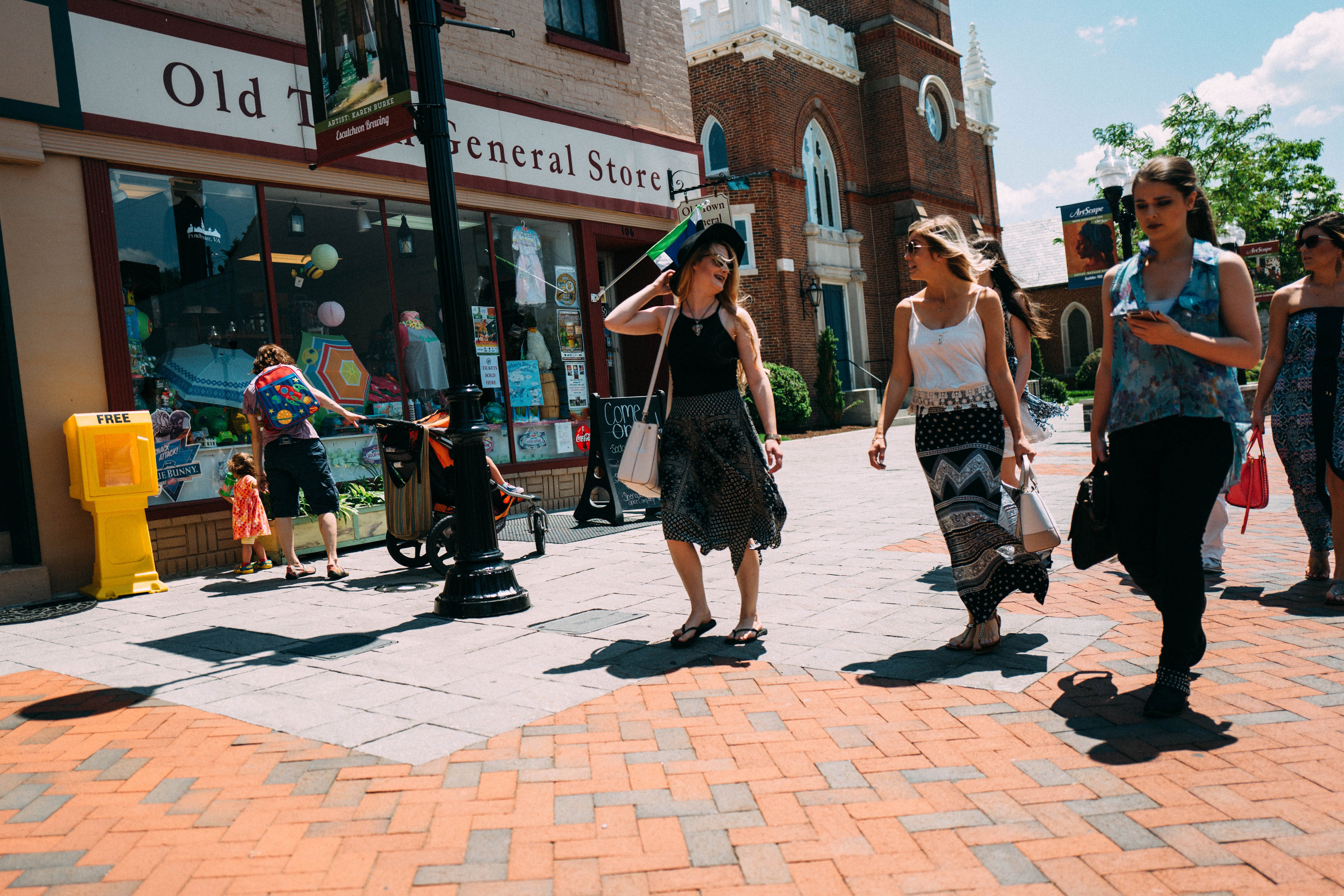 In a vibrant town square, a group of stylishly dressed women strolls under the warm sun, exuding a relaxed, carefree summer vibe. The composition captures their movement against a backdrop of quaint storefronts, with playful shadows dancing across the brightly colored brick pavement. Illuminated by natural light, the scene radiates joy and community spirit, making it an inviting glimpse of everyday life.